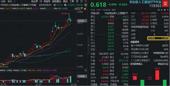 7月31日召开的国常会提出,要深入实施“人工智能+”行动,大力推进人工智能规模化商业化应用。资金看好AI后市表现,逢跌介入!同标的指数规模最大、流动性突出*的创业板人工智能ETF(159363)全天获资金净申购8000万份。