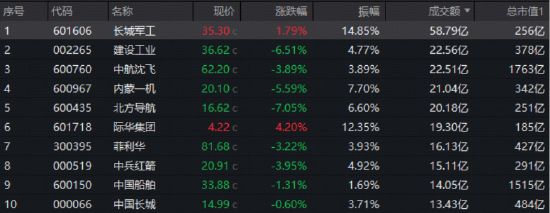 成份股方面,57跌23涨,地面兵装方向领跌,北方导航重挫7%。权重股集体飘绿,中航沈飞跌3.89%。多股巨振逾10%:长城军工振幅达14.85%逆市创新高;际华集团一度涨停,收涨4.2%;华秦科技午后发力领涨7.74%。