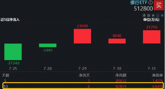 值得注意的是,券商板块回调区间,资金密集加码。上交所数据显示,银行ETF(512800)近10日累计获资金净流入9.28亿元。