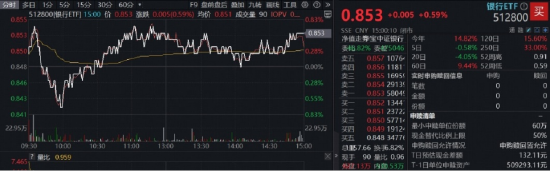 市场全天震荡调整,三大指数集体收跌。银行早盘高开下探,随后伴随着大盘回调、风险偏好收紧,银行转而走强,午后维持红盘震荡,百亿顶流银行ETF(512800)场内价格收涨0.59%,全天成交额9.85亿元。