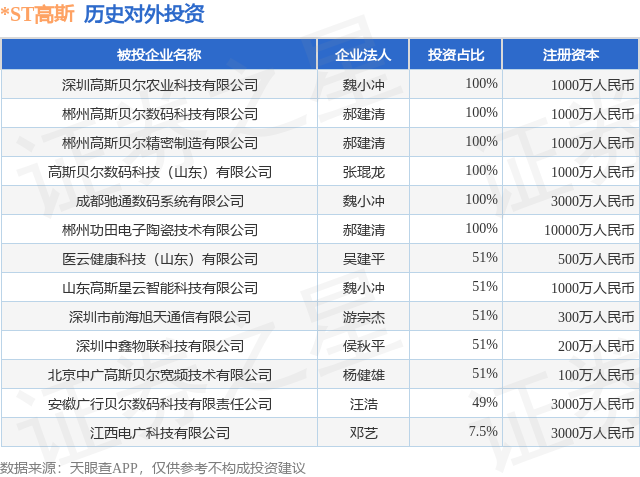 本站消息,根据天眼查APP显示炒股配资门户推荐网,*ST高斯(002848.SZ)新增一起对外投资事件,被投资公司为医云健康科技(山东)有限公司,法定代表人吴建平,投资占比为51%。该公司从事计算机、通信和其他电子设备制造业,注册资本为500万人民币。目前,*ST高斯共存在对外投资13项,详见下表: